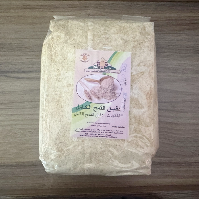 La Farine de Blé Complet est un produit authentique, 100 % naturel, issu d’un blé soigneusement sélectionné et moulu selon des méthodes artisanales. Cette farine, non raffinée, conserve toutes les parties du grain — le son, le germe et l’endosperme — garantissant une richesse exceptionnelle en fibres, minéraux et saveurs naturelles.
